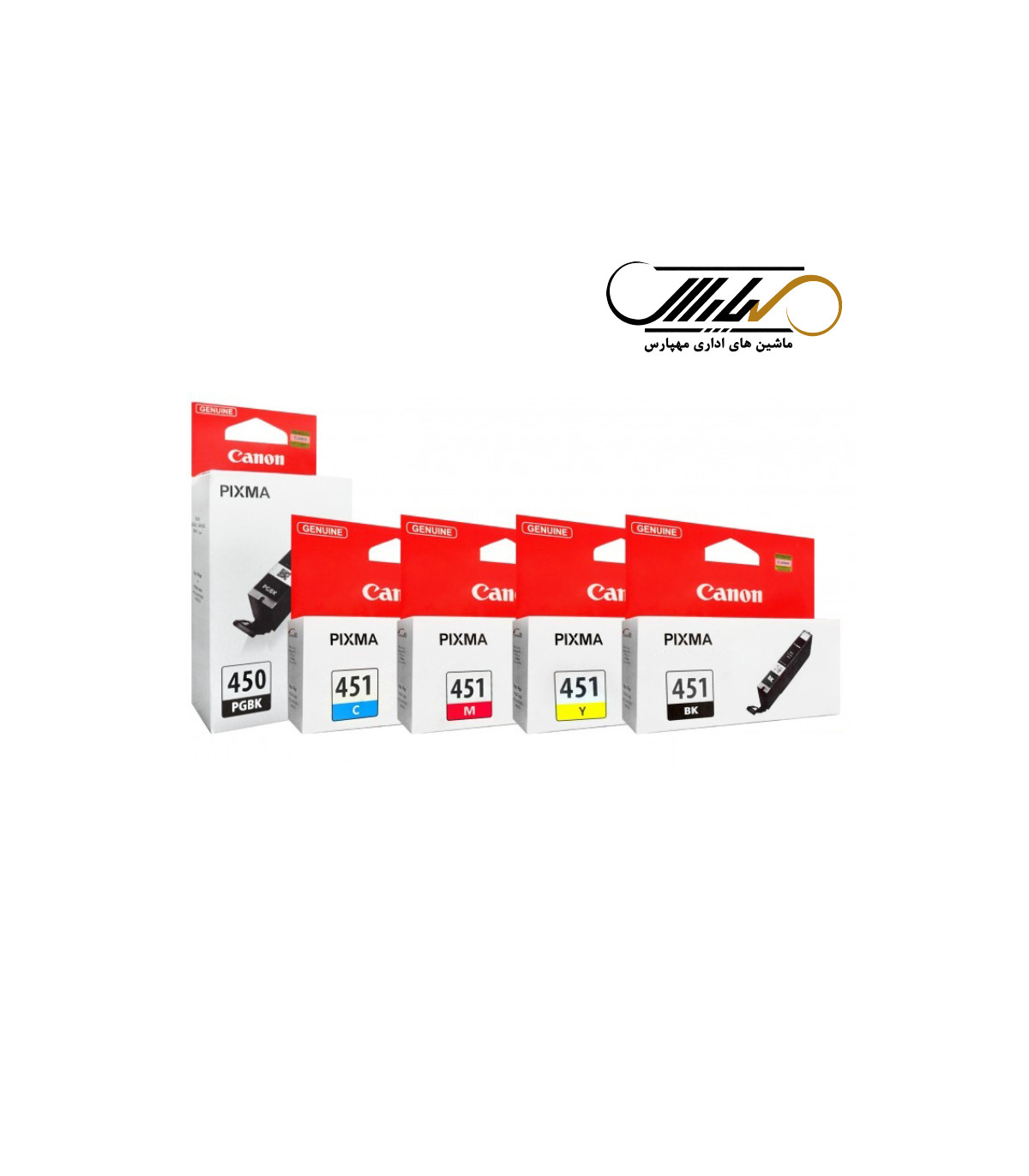 -کارتریج جوهرافشان کانن 450 و 451 که شامل یک عدد کد 450 مشکی بزرگ و چهار عدد کد 451 رنگی شامل زرد و قرمز و آبی و مشکی میباشد.